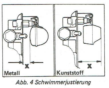 Durch beilegen von stärkeren oder dünneren Dichtungen unter das Schwimmernadelventil kann so das Niveau eingestellt werden. Oder das Schwimmernadelventil sitzt in einer Verstellbaren Verschraubung mit Kontermutter und kann so justiert werden. ( Bild rechts DDH ) |