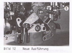 eingestellt mit einer Fühllehre oder einem Bohrerschaft . Die Öffnung ermöglicht das Anspringen und den einwandfreien Durchlauf der noch kalten Motors nach dem Kaltstart. Die Einstellung erfolgt hier an der Einstellschraube oder an einer Übertragungsstange mit Kontermuttern oder durch verbiegen der Übertragungsstange. ca. 3 - 5 mm Das richtige Maß steht auf dem betreffendem Kennblatt. |